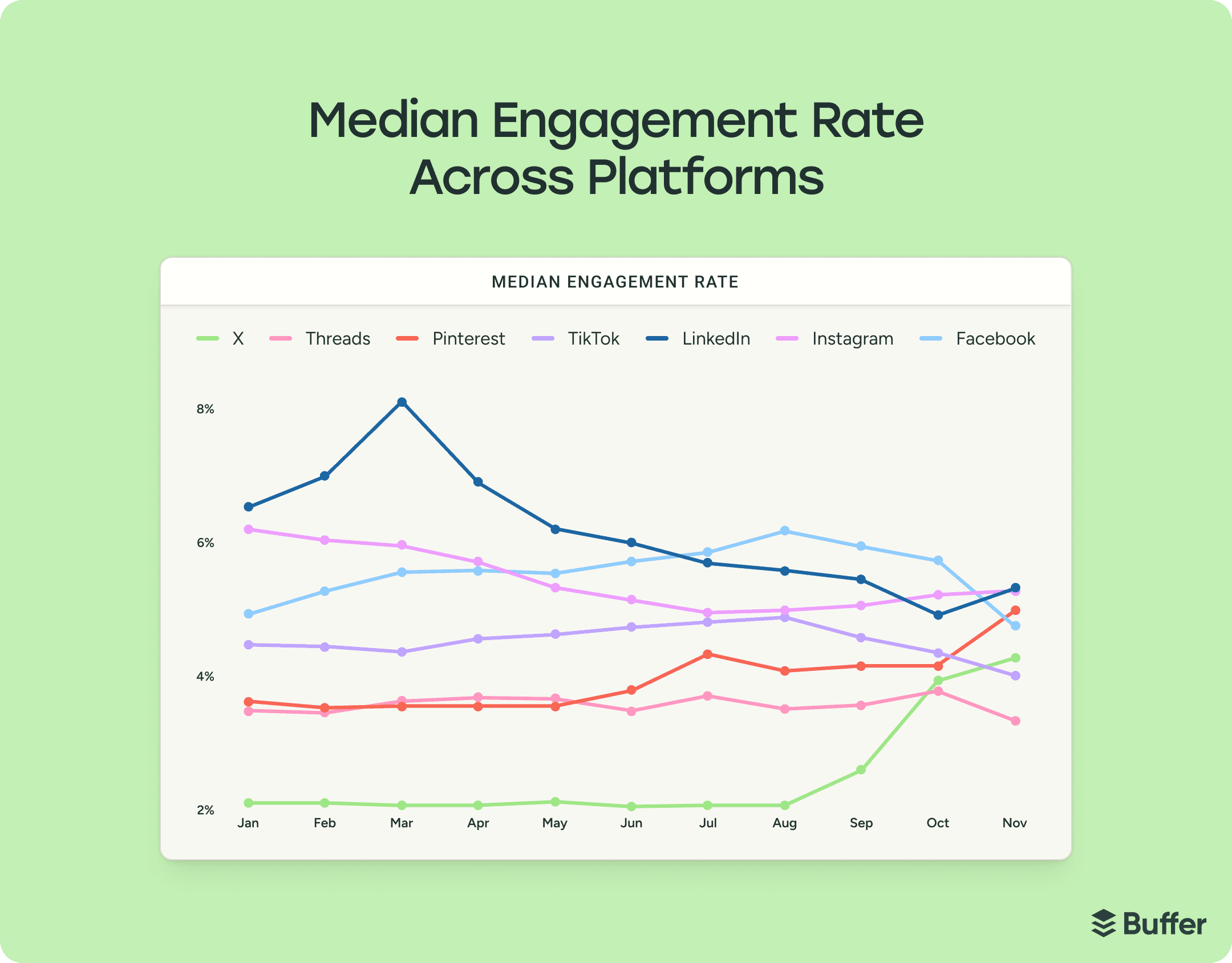 Podle dat Bufferu se typická míra engagementu mezi platformami výrazně liší. Median engagement ratu například vypadá přibližně takto: